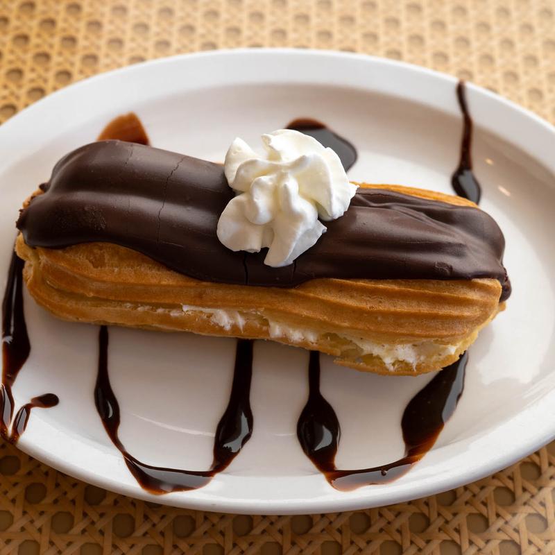 Soft pastry shell filled with our whipped Bavarian cream and iced with sweet chocolate.